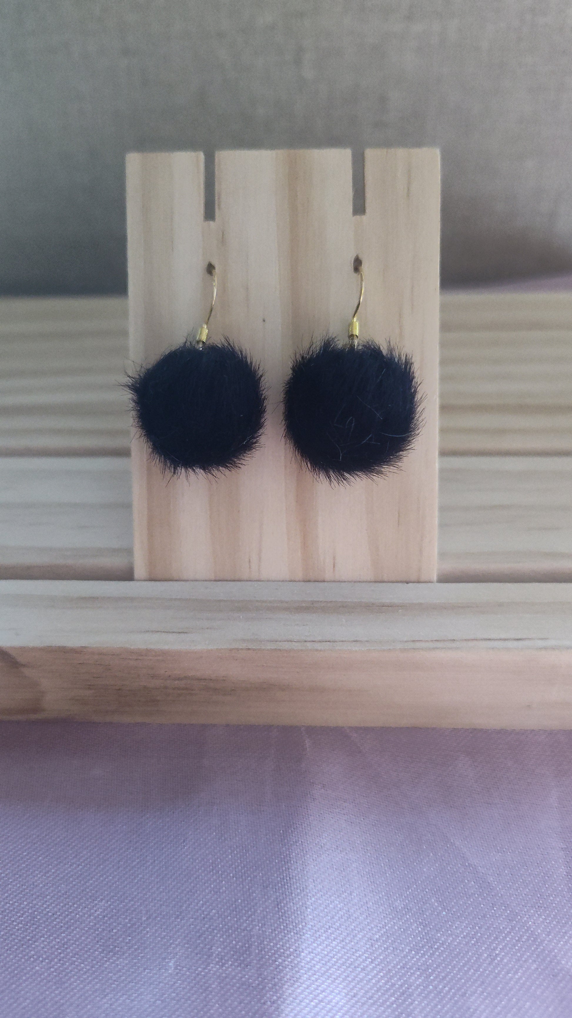 Black fluffy pompom earrings. Made with 18k gold sterling silver plated hooks and hypoallergenic as well.