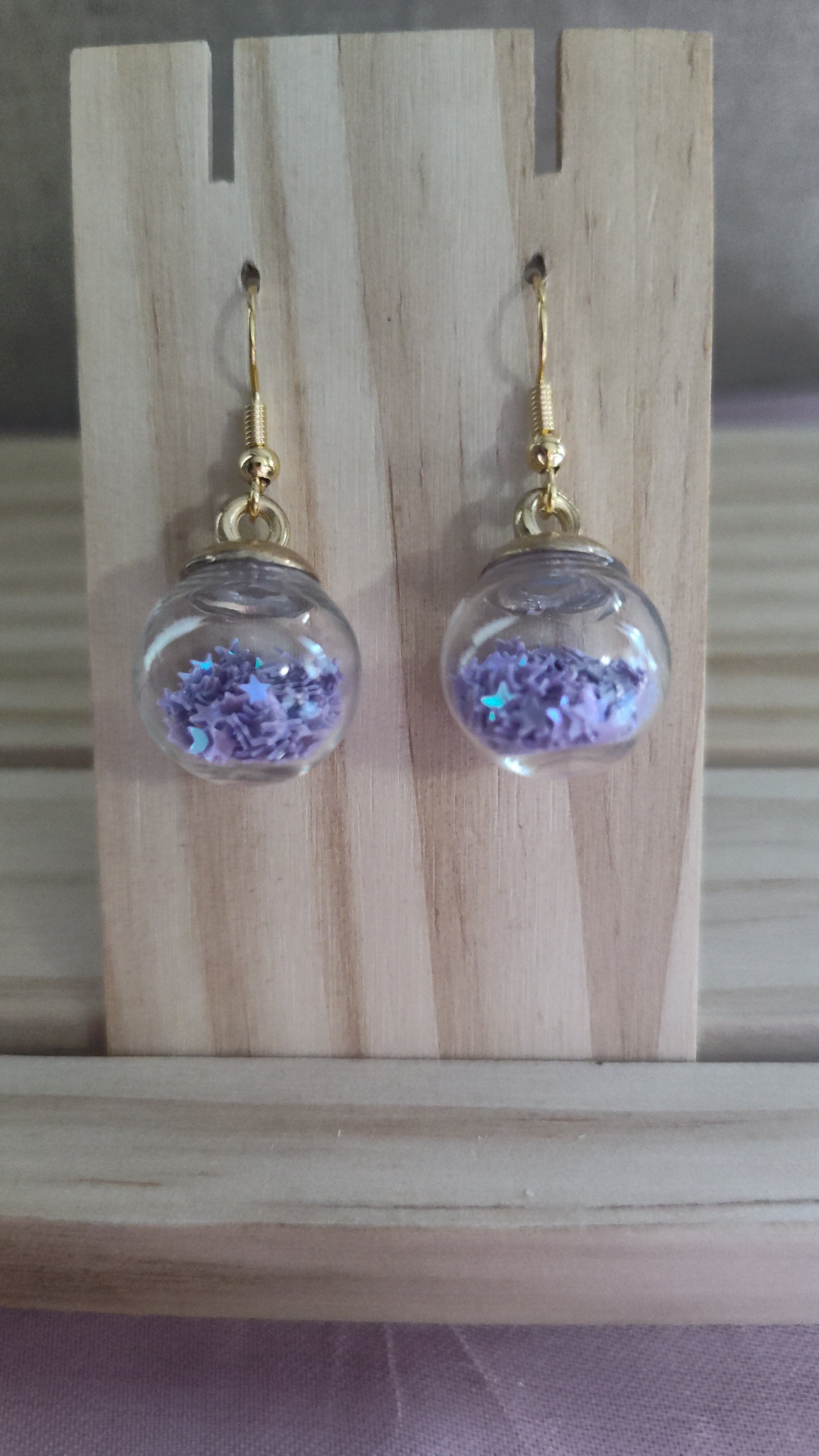 Elegant glass ball earrings filled with light purple stars. Made with 18k gold sterling silver plated hooks and hypoallergenic as well.