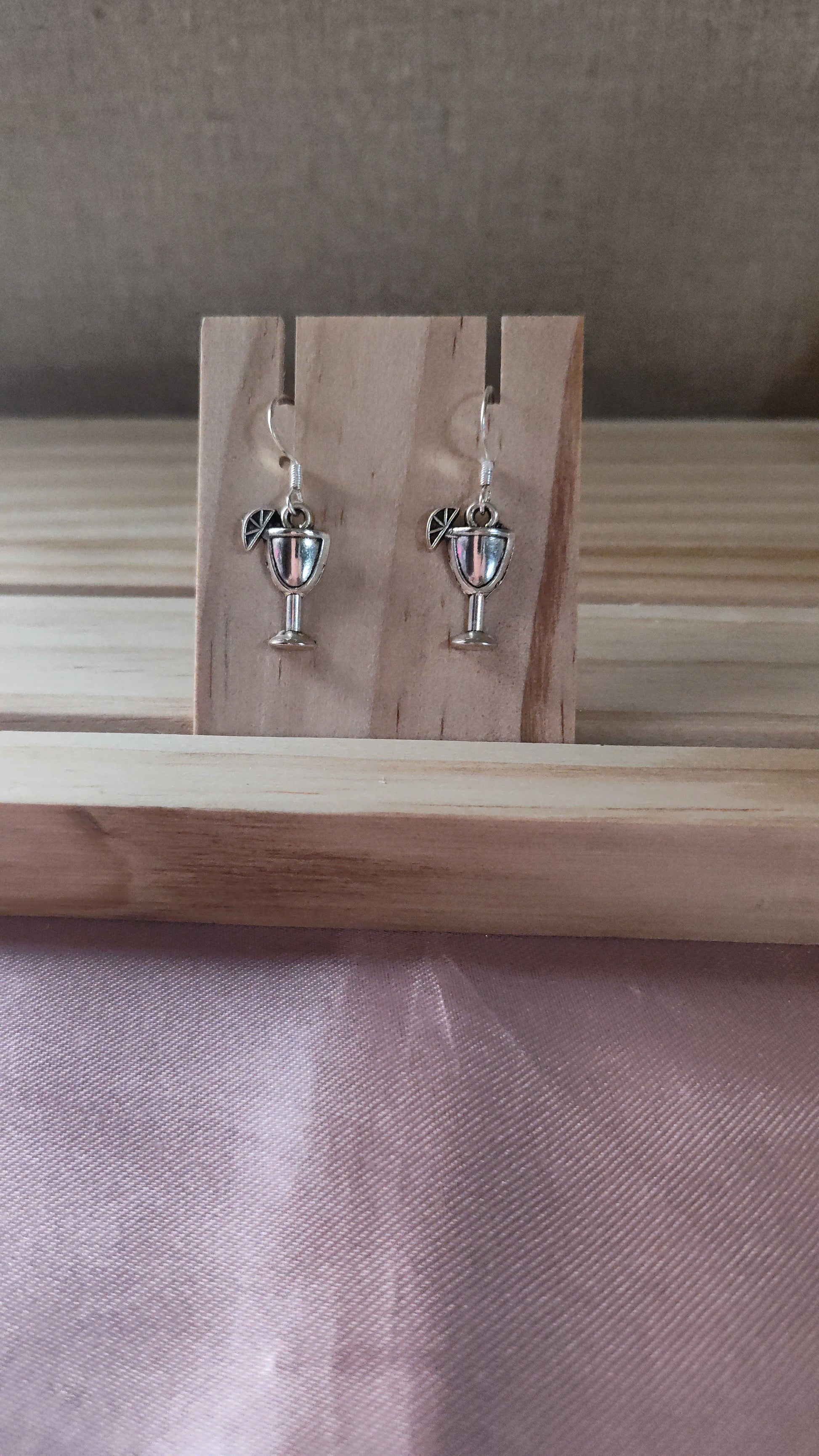 Cute wine or alcoholic beverage glass. Made with sterling silver plated hooks and hypoallergenic as well.